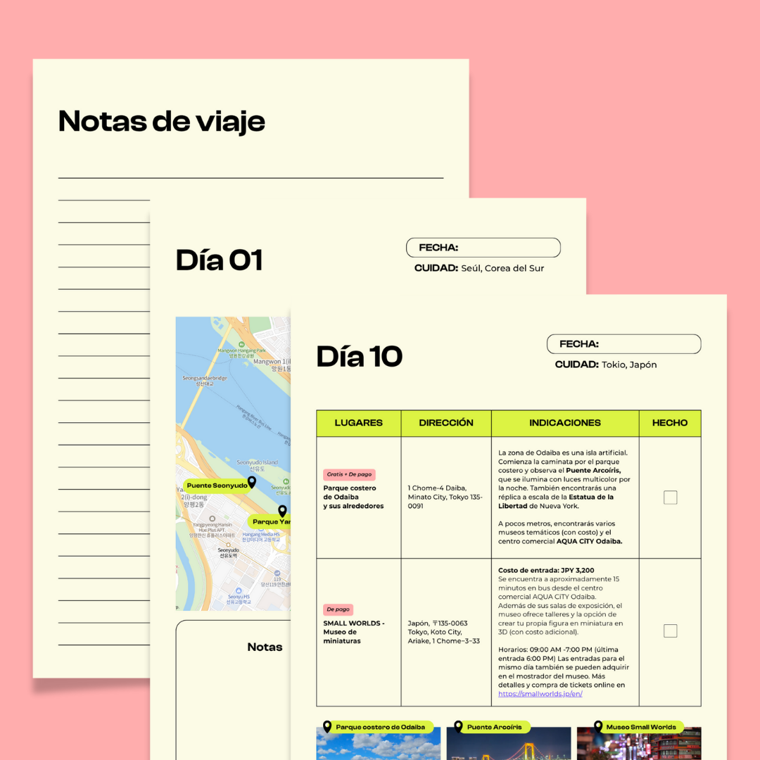 - Itinerario de 10 días con más de 30 actividades y lugares recomendados: direcciones, cómo llegar, costos y enlaces directos.